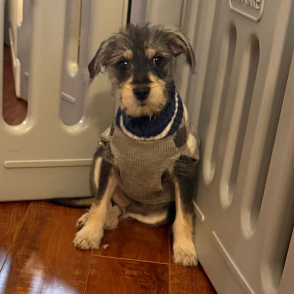 He’s crate trained and learning to use the doggie door to go potty outside — such a smart little guy!